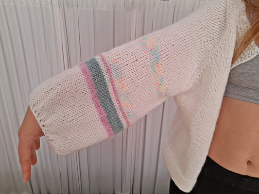 Thin yarn hand knit cardigan // white & touch of pastel color // 100% knit by mum // one of a kind // limited edition